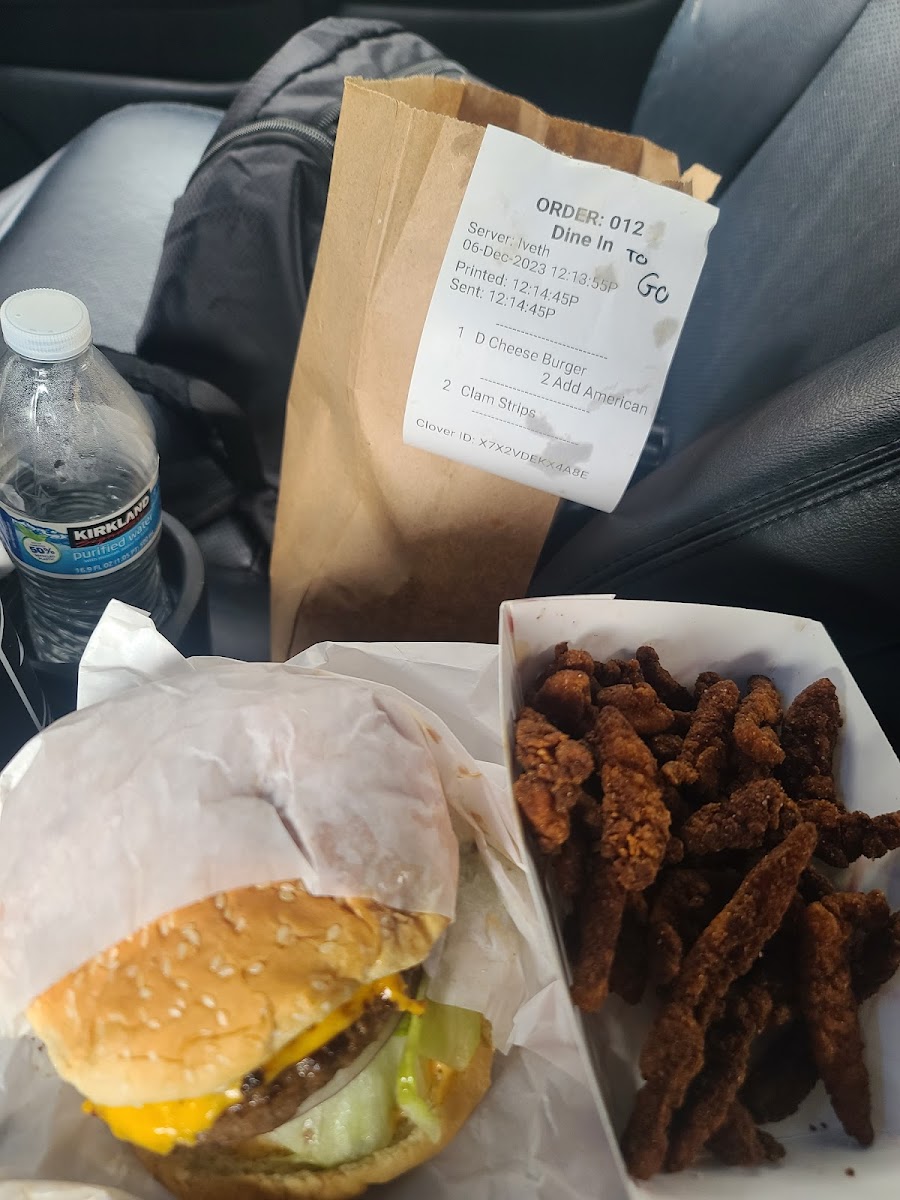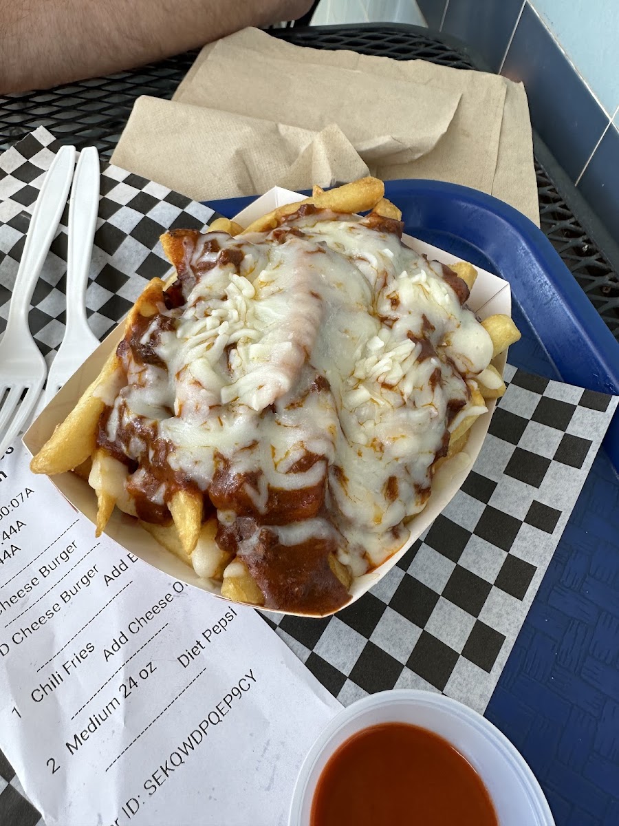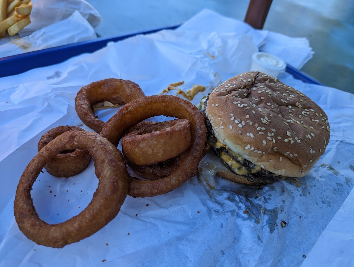 Burger and fries, w fried onions and the works. Classic. Delicious. Reasonable price, clean, great service. Very low key, almost drive-in style, but without the car ports. Egg rolls from another stop. Good.